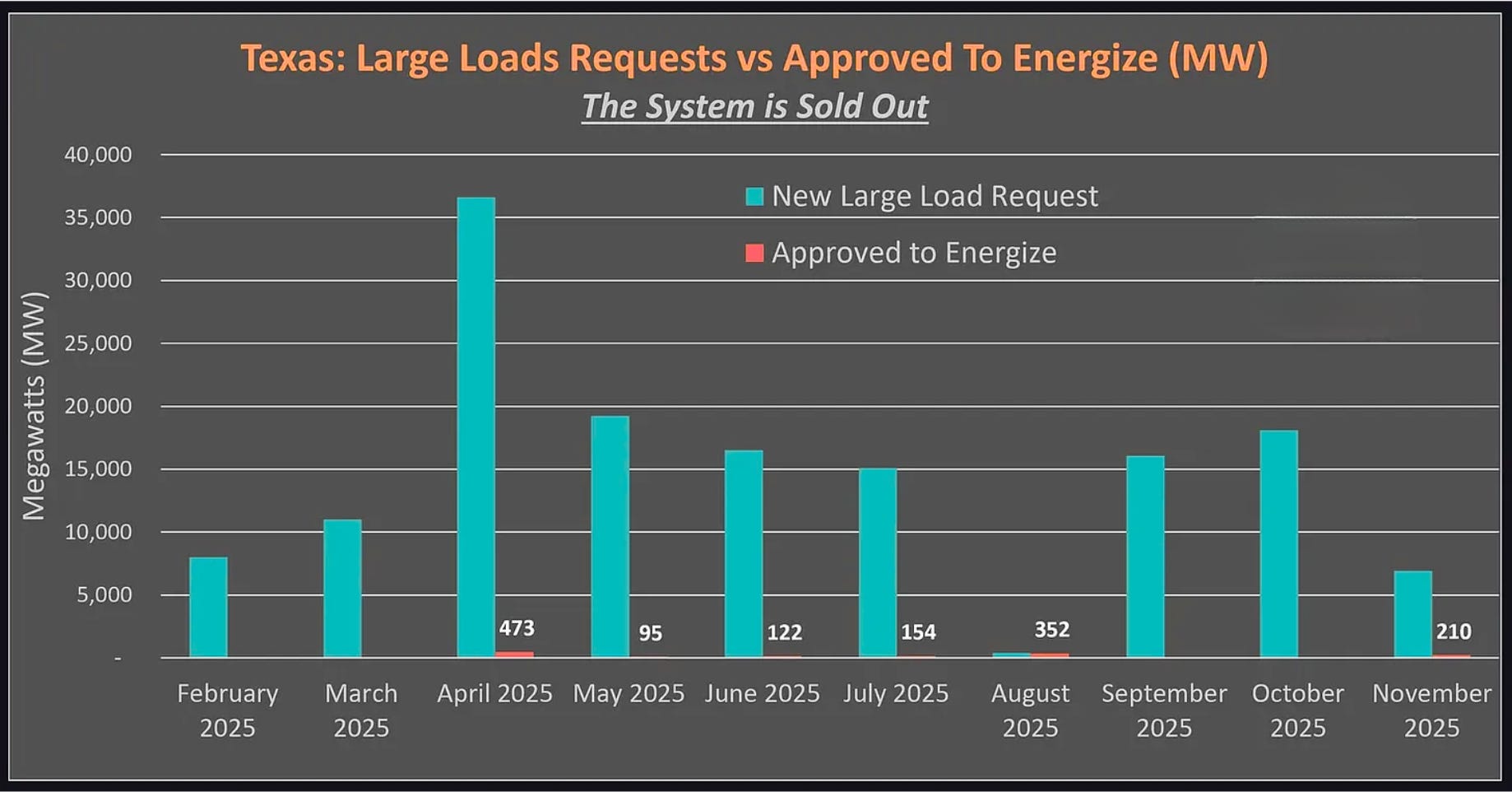 SemiAnalysis puts it plainly: In Texas alone, tens of gigawatts of data center load requests pour in every month. In all of 2025, barely more than a gigawatt got approved. The grid is sold out.