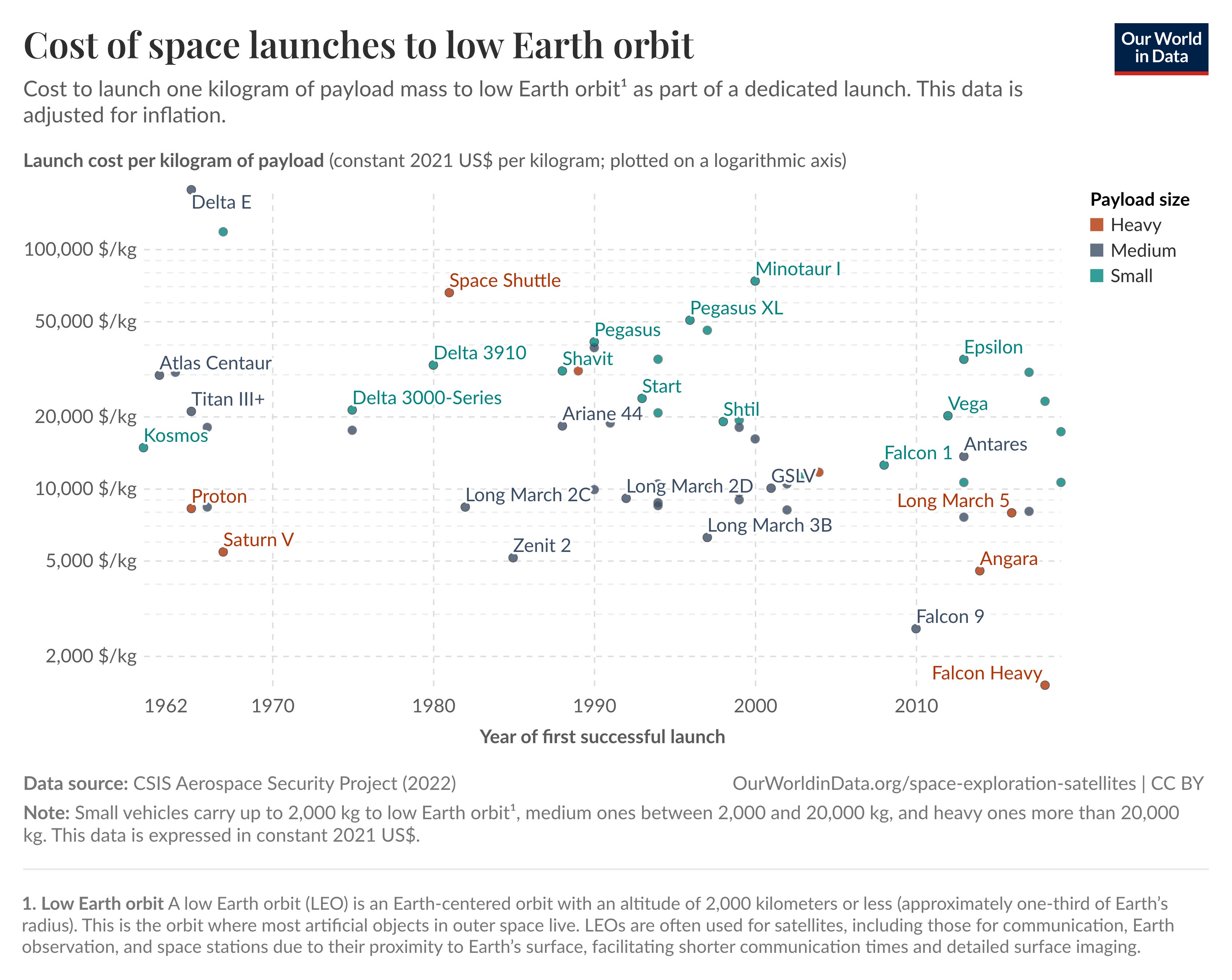 Launch cost fell ~95–97% in 60 years. The last decade did most of the work from $54,000 per kilogram in the 1970s to under $1,500 today. Getting to orbit is solved. Commercially, reusably, routinely.