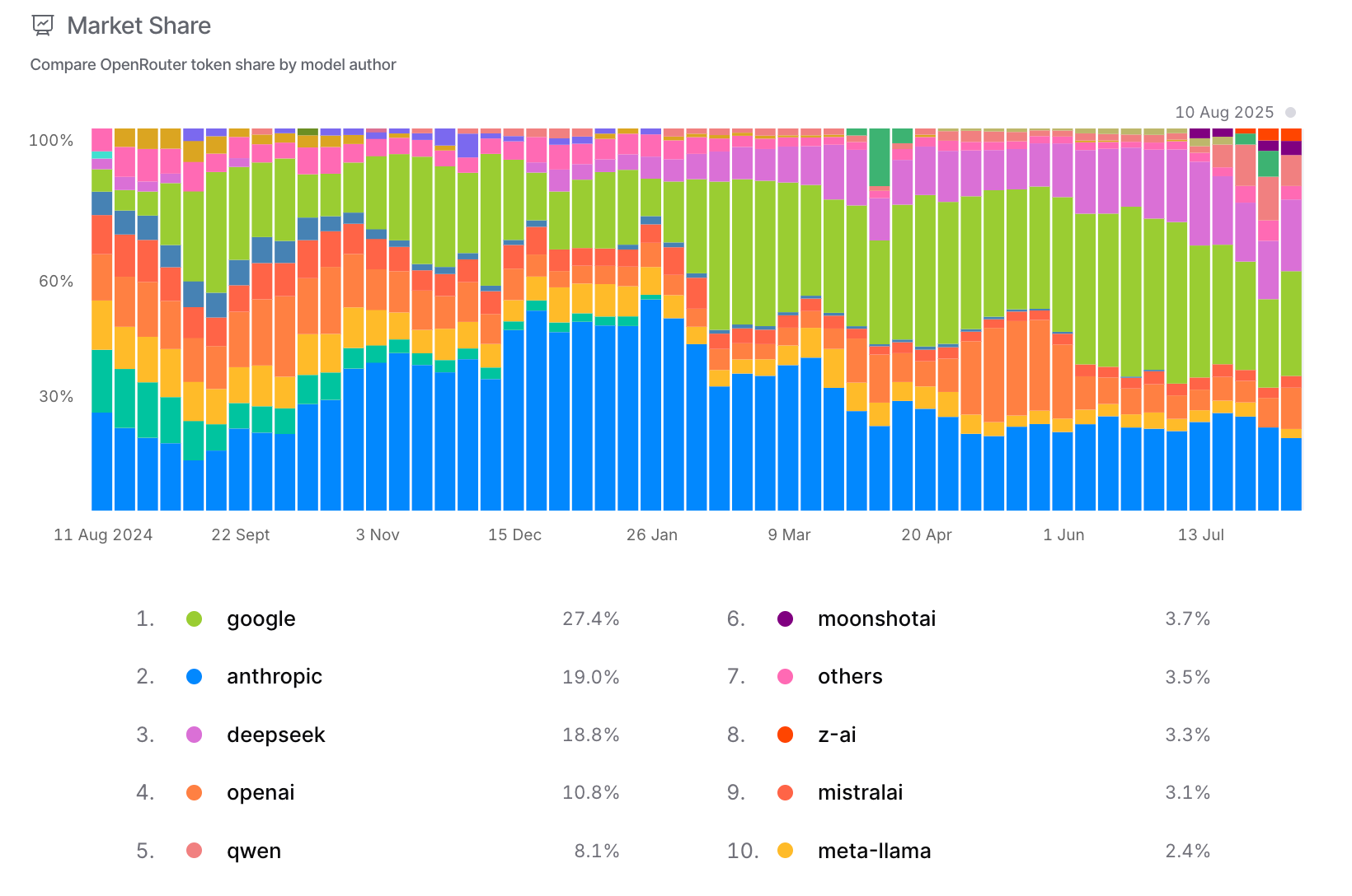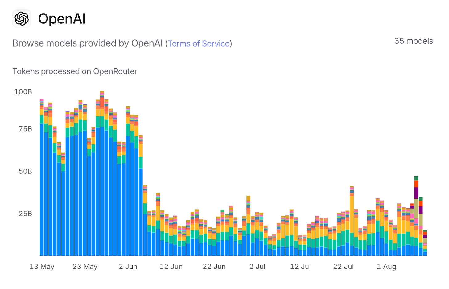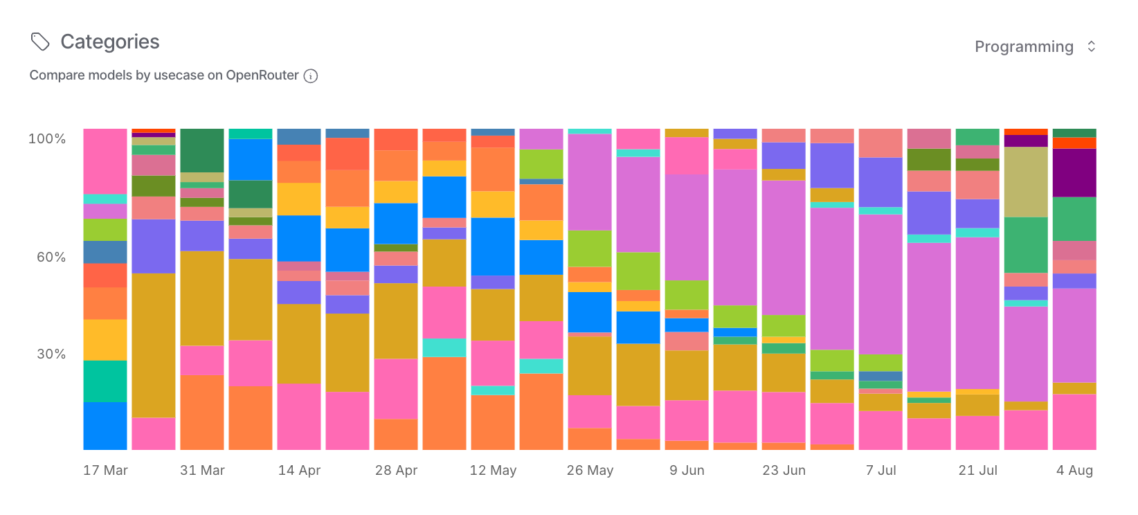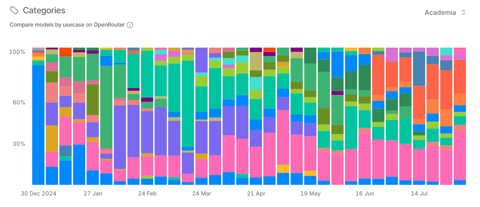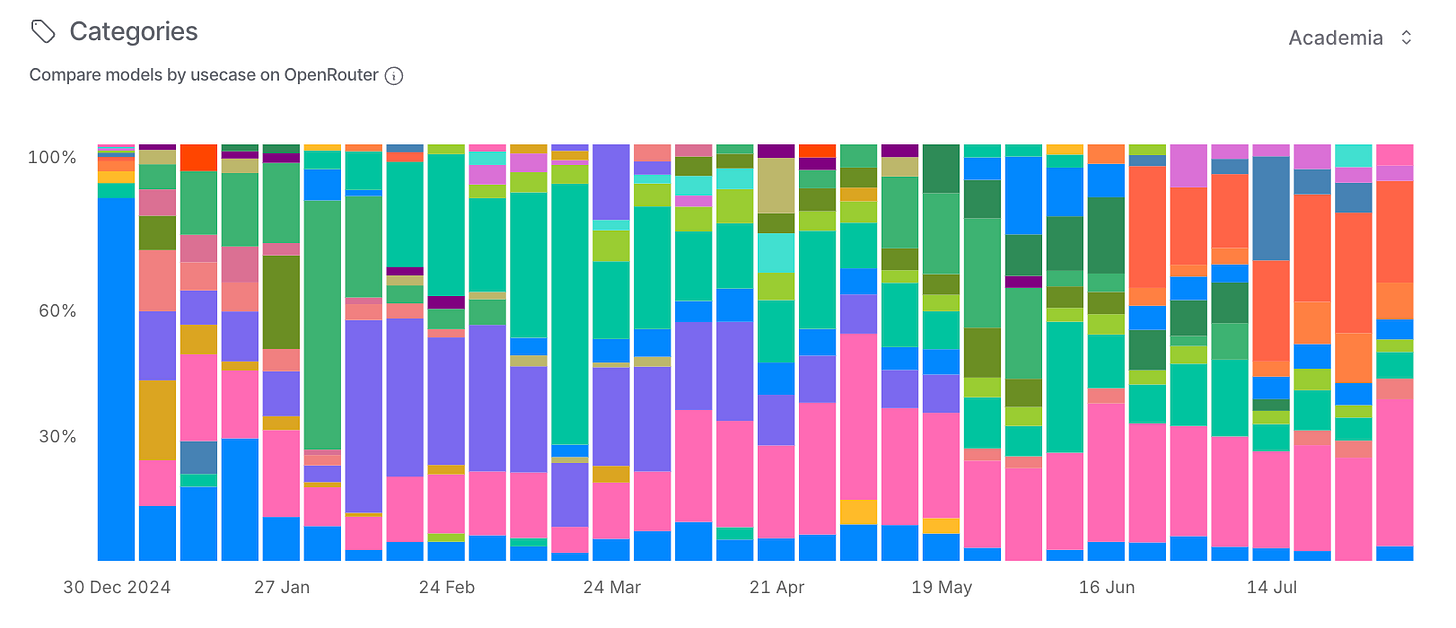 Looking at OpenRouter's usage by category over time, you can see how OpenAI dominated through early 2025, then sharply declined in June, while other providers filled the gap.